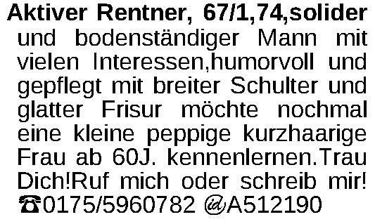 66/1,74,solider und bodenständiger Mann mit vielen Interessen,humorvoll und gepflegt mit breiter Schulter und glatter Frisur möchte nochmal eine nette,kleine Frau ab 60J. kennenlernen.Trau Dich!Tel.:0175/5960782Kontakt