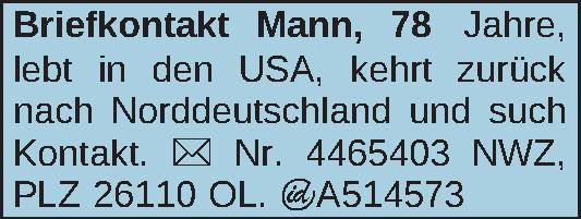 Mann, 78 Jahre, lebt in den USA, kehrt zurück nach Norddeutschland und such Kontakt.Kontakt