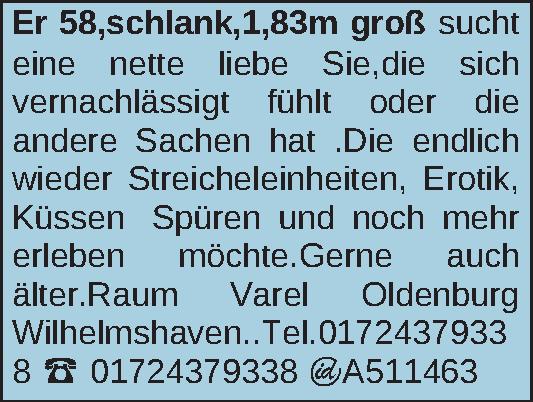58,schlank,1,83m groß sucht eine nette liebe Sie,die sich vernachlässigt fühlt oder die andere Sachen hat .Die endlich wieder Streicheleinheiten, Erotik, Küssen Spüren und noch mehr erleben möchte.Getne auch älter.Raum Varel Oldenburg Wilhelmshaven.