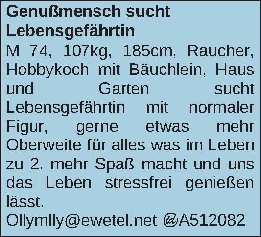 M 74, 107kg, 185cm, Raucher, Hobbykoch mit Bäuchlein, Haus und Garten sucht Lebensgefährtin mit normaler Figur, gerne etwas mehr Oberweite für alles was im Leben zu 2. mehr Spaß macht und uns das Leben stressfrei genießen lässt.Kontakt