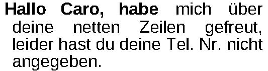 habe mich über deine netten Zeilen gefreut, leider hast du deine Tel. Nr. nicht angegeben.