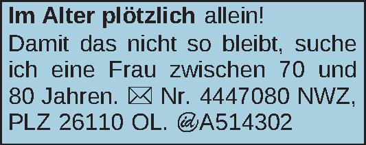Damit das nicht so bleibt, suche ich eine Frau zwischen 70 und 80 Jahren.Kontakt