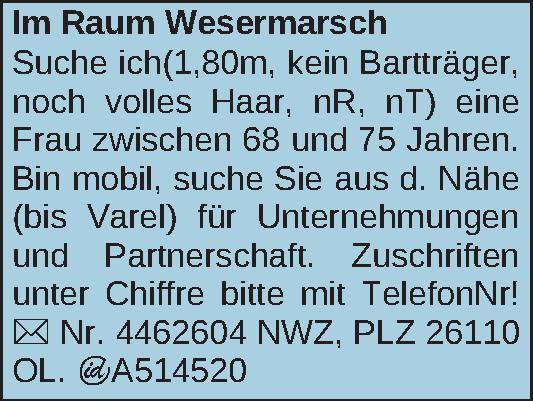Suche ich (1,80m, nT, nR, kein Bartträger, dafür noch volles Haar) eine Frau zwischen 68 und 75 Jahren. Bin mobil, suche Sie aus d. Nähe (bis Varel) für Unternehmungen und Partnerschaft. Zuschriften unter Chiffre bitte mit Telefonnummer!Kontakt