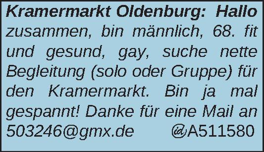 Hallo zusammen, bin männlich, 68. fit und gesund, gay, suche nette Begleitung (solo oder Gruppe) für den Kramermarkt. Bin ja mal gespannt ... 503246@gmx.deKontakt