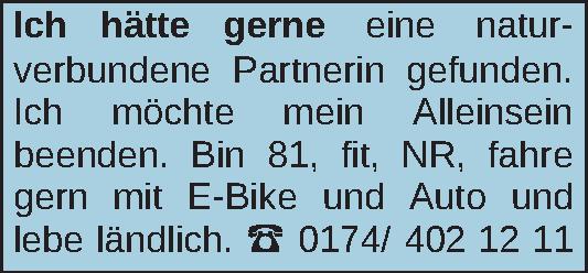 Ich hätte gerne eine naturverbundene Partnerin gefunden. Ich möchte mein Alleinsein beenden. Bin 81, fit, NR, fahre gern mit E-Bike und Auto und lebe ländlich. 0174/ 402 12 11