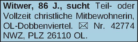 Witwer, 86 J., sucht Teil- oder Vollzeit christliche Mitbewohnerin, OL-Dobbenviertel. ¤ Nr. 42774 NWZ, PLZ 26110 OL.Kontakt