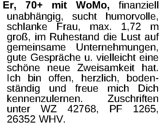 Er, 70+ mit WoMo, finanziell unabhängig, sucht humorvolle, schlanke Frau, max. 1,72 m groß, im Ruhestand die Lust auf gemeinsame Unternehmungen, gute Gespräche u. vielleicht eine schöne neue Zweisamkeit hat. Ich bin offen, herzlich, bodenständig und freue mich Dich kennenzulernen. Zuschriften unter WZ 42768, PF 1265, 26352 WHV.