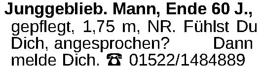 Junggeblieb. Mann, Ende 60 J., gepflegt, 1,75 m, NR. Fühlst Du Dich, angesprochen? Dann melde Dich. ‡ 01522/1484889Kontakt