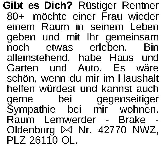 Gibt es Dich? Rüstiger Rentner 80+ möchte einer Frau wieder einem Raum in seinem Leben geben und mit Ihr gemeinsam noch etwas erleben. Bin alleinstehend, habe Haus und Garten und Auto. Es wäre schön, wenn du mir im Haushalt helfen würdest und kannst auch gerne bei gegenseitiger Sympathie bei mir wohnen. Raum Lemwerder - Brake Oldenburg ¤ Nr. 42770 NWZ, PLZ 26110 OL.