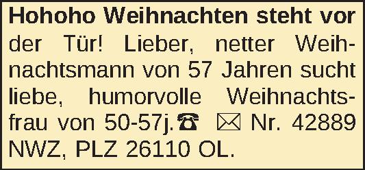 Hohoho Weihnachten steht vor der Tür! Lieber, netter Weihnachtsmann von 57 Jahren sucht liebe, humorvolle Weihnachtsfrau von 50-57j. ¤ Nr. 42889 NWZ, PLZ 26110 OL.