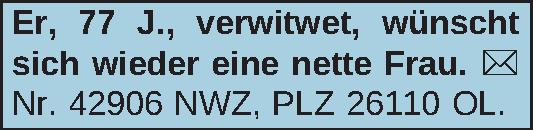 Er, 77 J., verwitwet, wünscht sich wieder eine nette Frau. ¤ Nr. 42906 NWZ, PLZ 26110 OL.Kontakt
