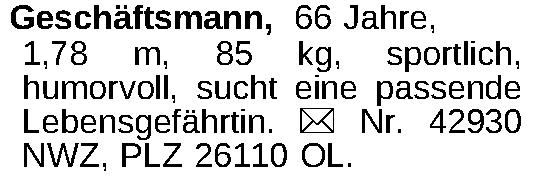 Geschäftsmann, 66 Jahre, 1,78 m, 85 kg, sportlich, humorvoll, sucht eine passende Lebensgefährtin. ¤ Nr. 42930 NWZ, PLZ 26110 OL.Kontakt