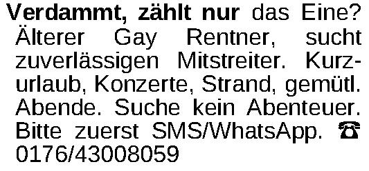 Verdammt, zählt nur das Eine? Älterer Gay Rentner, sucht zuverlässigen Mitstreiter. Kurzurlaub, Konzerte, Strand, gemütl. Abende. Suche kein Abenteuer. Bitte zuerst SMS/WhatsApp. ‡ 0176/43008059Kontakt