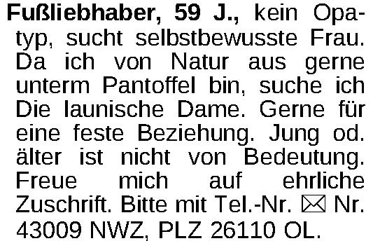 Fußliebhaber, 59 J., kein Opatyp, sucht selbstbewusste Frau. Da ich von Natur aus gerne unterm Pantoffel bin, suche ich Die launische Dame. Gerne für eine feste Beziehung. Jung od. älter ist nicht von Bedeutung. Freue mich auf ehrliche Zuschrift. Bitte mit Tel.-Nr. ¤ Nr. 43009 NWZ, PLZ 26110 OL.Kontakt