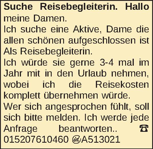 Hallo meine Damen.Ich suche eine Aktive, Dame die allen schönen aufgeschlossen ist Als Reisebegleiterin.