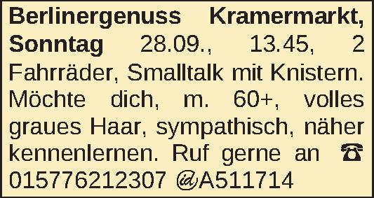 Kramermarkt, Sonntag 28., 13.45h, 2 Fahrräder, Smalltalk mit Knistern. Möchte dich, m. 60+, volles graues Haar näher kennenlernen. Ruf gerne an 015776212307Kontakt