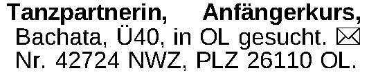 Tanzpartnerin, Anfängerkurs, Bachata, Ü40, in OL gesucht. ¤ Nr. 42724 NWZ, PLZ 26110 OL.