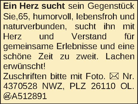 Sie,65, humorvoll, lebensfroh und naturverbunden, sucht ihn mit Herz und Verstand für gemeinsame Erlebnisse und eine schöne Zeit zu zweit. Lachen erwünscht!Zuschriften bitte mit Foto.