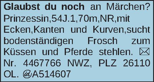 Prinzessin, 54J.1,70m,NR,mit Ecken,Kanten und Kurven,sucht bodenständigen Frosch zum Küssen und Pferde stehlen.Kontakt