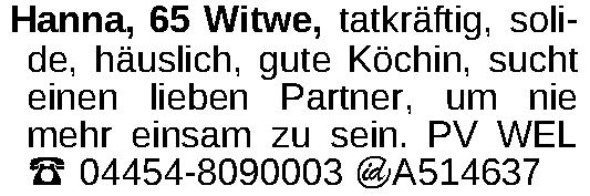 Witwe, tatkräftig, solide, häuslich, gute Köchin, sucht einen lieben Partner, gerne älter, um nie mehr einsam sein zu müssen. PV WELKontakt