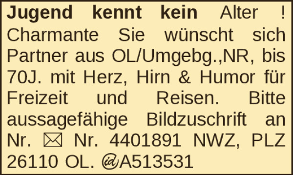 Charmante Sie wünscht sich Partner bis 70J. mit Herz, Hirn & Humor für Freizeit und Reisen. Bitte aussagefähige Bildzuschrift an Chiffre Nr.Kontakt