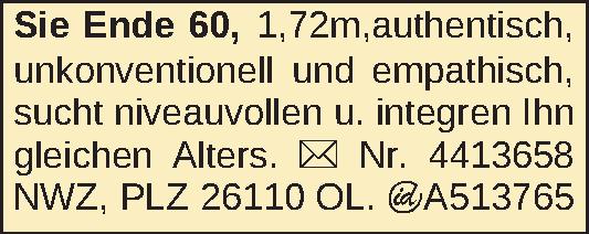 1,72m, authentisch, unkonventionell u. empathisch sucht niveauvollen u. integren Ihn gleichen Alters.Kontakt