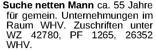 Suche netten Mann ca. 55 Jahre für gemein. Unternehmungen im Raum WHV. Zuschriften unter WZ 42780, PF 1265, 26352 WHV.Kontakt