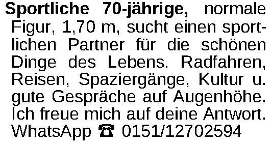 Sportliche 70-jährige, normale Figur, 1,70 m, sucht einen sportlichen Partner für die schönen Dinge des Lebens. Radfahren, Reisen, Spaziergänge, Kultur u. gute Gespräche auf Augenhöhe. Ich freue mich auf deine Antwort. WhatsApp ‡ 0151/12702594Kontakt