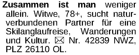 Zusammen ist man weniger allein. Witwe, 78+, sucht naturverbundenen Partner für eine Skilanglaufreise, Wanderungen und Kultur. ¤ Nr. 42839 NWZ, PLZ 26110 OL.Kontakt