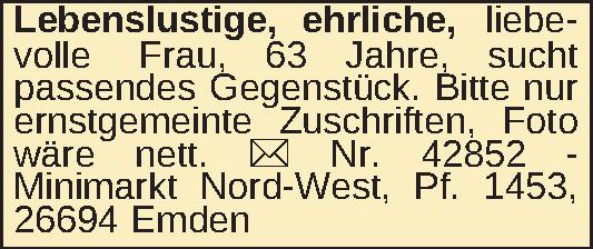 Lebenslustige, ehrliche, liebevolle Frau, 63 Jahre, sucht passendes Gegenstück. Bitte nur ernstgemeinte Zuschriften, Foto wäre nett. ¤ Nr. 42852 Minimarkt Nord-West, Pf. 1453, 26694 EmdenKontakt
