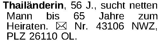Thailänderin, 56 J., sucht netten Mann bis 65 Jahre zum Heiraten. ¤ Nr. 43106 NWZ, PLZ 26110 OL.Kontakt