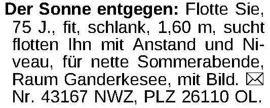 Der Sonne entgegen: Flotte Sie, 75 J., fit, schlank, 1,60 m, sucht flotten Ihn mit Anstand und Niveau, für nette Sommerabende, Raum Ganderkesee, mit Bild. ¤ Nr. 43167 NWZ, PLZ 26110 OL.Kontakt