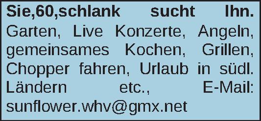 Sie, 60, schlank sucht Ihn. Garten, Live Konzerte, Angeln, gemeinsames Kochen, Grillen, Chopper fahren, Urlaub in südl. Ländern etc.Kontakt