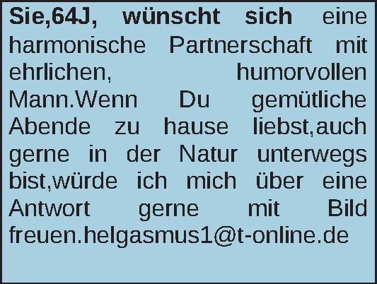 wünscht sich eine harmonische Partnerschaft mit ehrlichen, humorvollen Mann.Wenn Du gemütliche Abende zu hause liebst,auch gerne in der Natur unterwegs bist,würde ich mich über eine Antwort gerne mit Bild freuen.