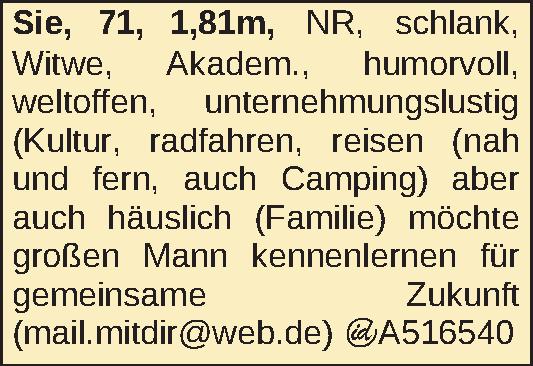 1,81m, NR, schlank, Witwe, Akadem., humorvoll, weltoffen, unternehmungslustig (Kultur, radfahren, reisen (nah und fern, auch Camping) aber auch häuslich (Familie) möchte großen Mann kennenlernen für gemeinsame Zukunft (mail.mitdir@web.de)Kontakt