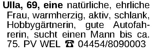 eine natürliche, ehrliche Frau, warmherzig, aktiv, schlank, Hobbygärtnerin, sichere Autofahrerin, sucht einen aktiven Mann bis ca. 75. PV WELKontakt