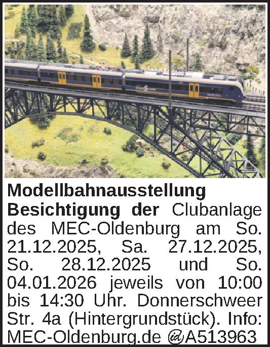 Besichtigung der Clubanlage des MEC-Oldenburg am So. 21.12.2025, Sa. 27.12.2025, So. 28.12.2025 und So. 04.01.2026 jeweils von 10:00 bis 14:30 Uhr. Donnerschweer Str. 4a (Hintergrundstück). Info: MEC-Oldenburg.deKontakt