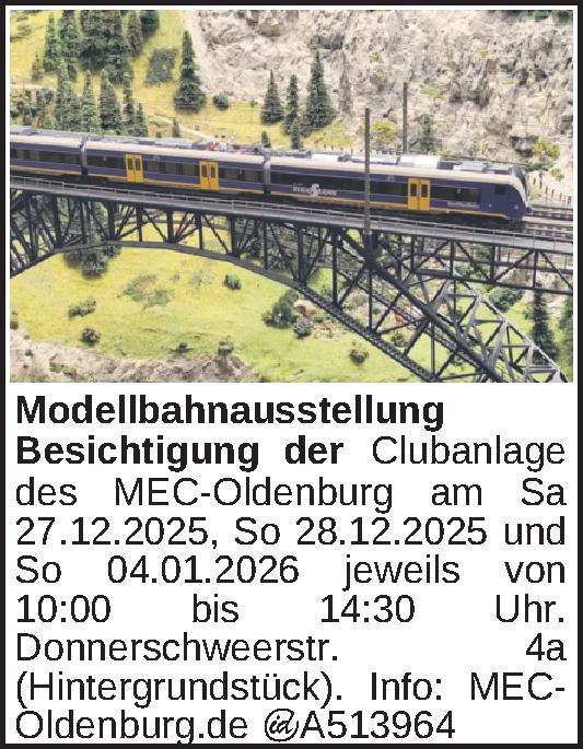 Besichtigung der Clubanlage des MEC-Oldenburg am Sa 27.12.2025, So 28.12.2025 und So 04.01.2026 jeweils von 10:00 bis 14:30 Uhr. Donnerschweerstr. 4a (Hintergrundstück). Info: MEC-Oldenburg.deKontakt