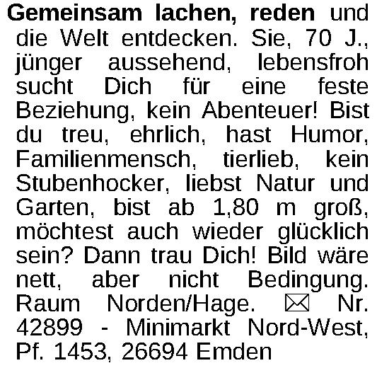 Gemeinsam lachen, reden und die Welt entdecken. Sie, 70 J., jünger aussehend, lebensfroh sucht Dich für eine feste Beziehung, kein Abenteuer! Bist du treu, ehrlich, hast Humor, Familienmensch, tierlieb, kein Stubenhocker, liebst Natur und Garten, bist ab 1,80 m groß, möchtest auch wieder glücklich sein? Dann trau Dich! Bild wäre nett, aber nicht Bedingung. Raum Norden/Hage. ¤ Nr. 42899 - Minimarkt Nord-West, Pf. 1453, 26694 EmdenKontakt