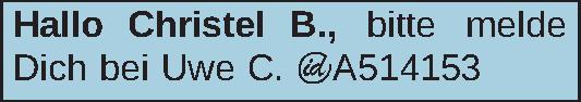 Hallo Christel B., bitte melde Dich bei Uwe C.Kontakt