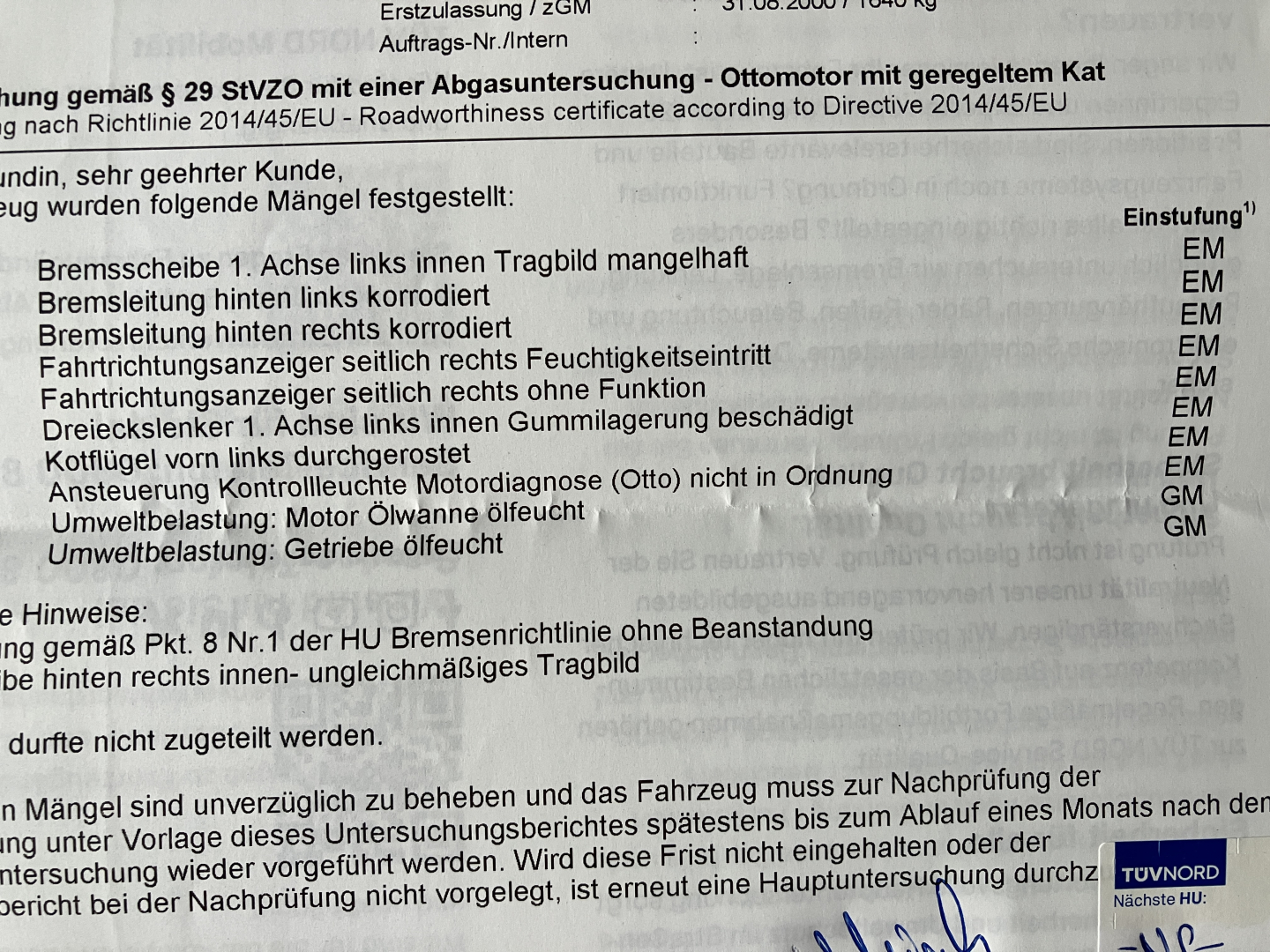 (Mängel siehe TÜV–Bericht – Foto; der Blinker rechts/seitlich funktioniert bereits wieder:))