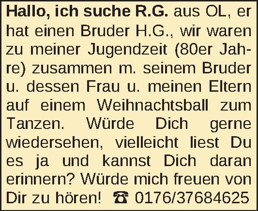 Hallo, ich suche R.G. aus OL, er hat einen Bruder H.G., wir waren zu meiner Jugendzeit (80er Jahre) zusammen m. seinem Bruder u. dessen Frau u. meinen Eltern auf einem Weihnachtsball zum Tanzen. Würde Dich gerne wiedersehen, vielleicht liest Du es ja und kannst Dich daran erinnern? Würde mich freuen von Dir zu hören! ‡ 0176/37684625Kontakt