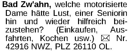 Bad Zw'ahn, welche motorisierte Dame hätte Lust, einer Seniorin hin und wieder hilfreich beizustehen? (Einkaufen, Ausfahrten, Kochen usw.) ¤ Nr. 42916 NWZ, PLZ 26110 OL.Kontakt