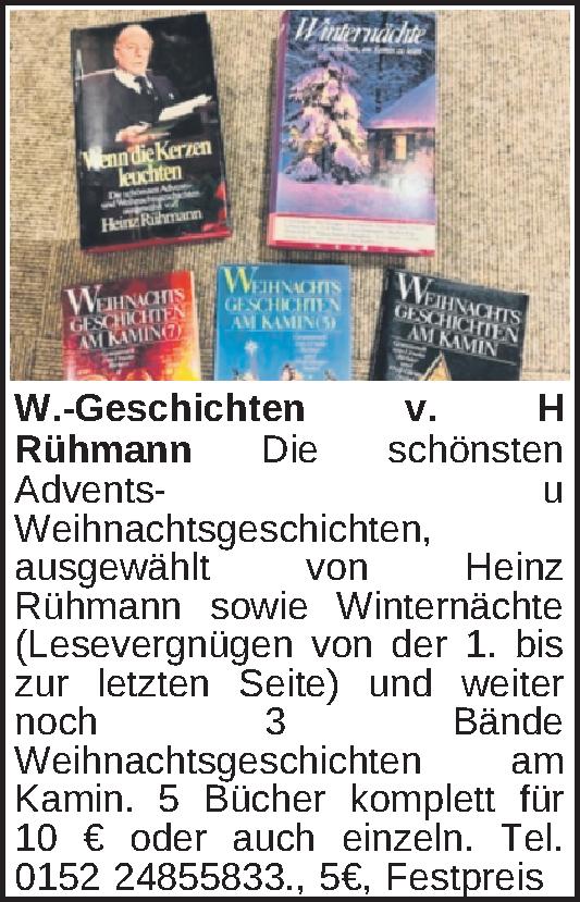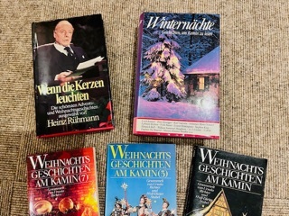 Die schönsten Advents- u Weihnachtsgeschichten, ausgewählt von Heinz Rühmann sowie Winternächte (Lesevergnügen von der 1. bis zur letzten Seite) und weiter noch 3 Bände Weihnachtsgeschichten am Kamin. 5 Bücher komplett für 10 € oder auch einzeln. TelKontakt
