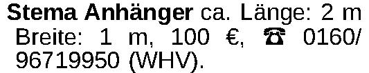 Stema Anhänger ca. Länge: 2 m Breite: 1 m, 100 €, ‡ 0160/ 96719950 (WHV).Kontakt