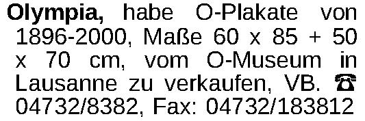 Olympia, habe O-Plakate von 1896-2000, Maße 60 x 85 + 50 x 70 cm, vom O-Museum in Lausanne zu verkaufen, VB. ‡ 04732/8382, Fax: 04732/183812Kontakt