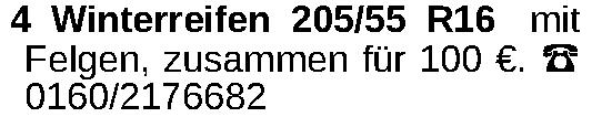 4 Winterreifen 205/55 R16 mit Felgen, zusammen für 100 €. ‡ 0160/2176682Kontakt
