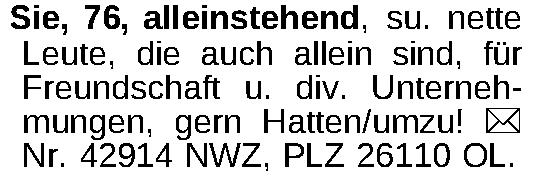 Sie, 76, alleinstehend, su. nette Leute, die auch allein sind, für Freundschaft u. div. Unternehmungen, gern Hatten/umzu! ¤ Nr. 42914 NWZ, PLZ 26110 OL.Kontakt