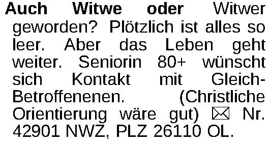 Auch Witwe oder Witwer geworden? Plötzlich ist alles so leer. Aber das Leben geht weiter. Seniorin 80+ wünscht sich Kontakt mit GleichBetroffenenen. (Christliche Orientierung wäre gut) ¤ Nr. 42901 NWZ, PLZ 26110 OL.Kontakt