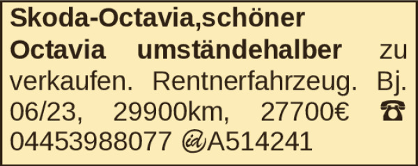 Skoda-Octavia,schöner Octavia umständehalber zu verkaufen. Rentnerfahrzeug. Bj. 06/23, 29900km, 27700€ ‡ 04453988077 ¬A514241Kontakt